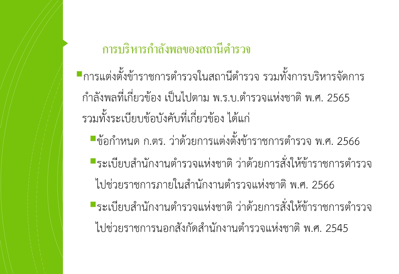 - ระเบียบสำนักงานตำรวจแห่งชาติ ว่าด้วยการสั่งให้ข้าราชการตำรวจไปปฏิบัติราชการภายในสำนักงานตำรวจแห่งชาติ พ.ศ.2566